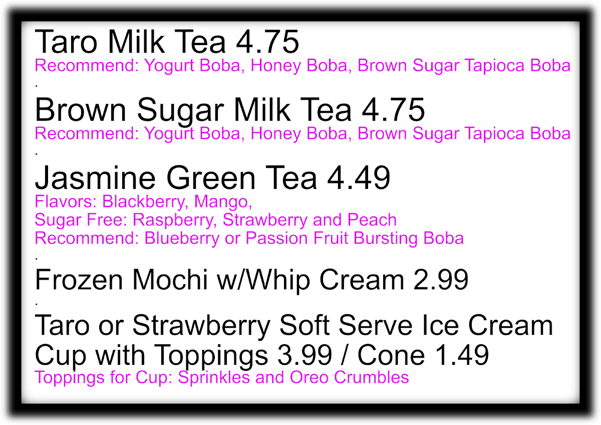 Includes yogurt bursting boba, honey bursting boba, and brown sugar tapioca boba.